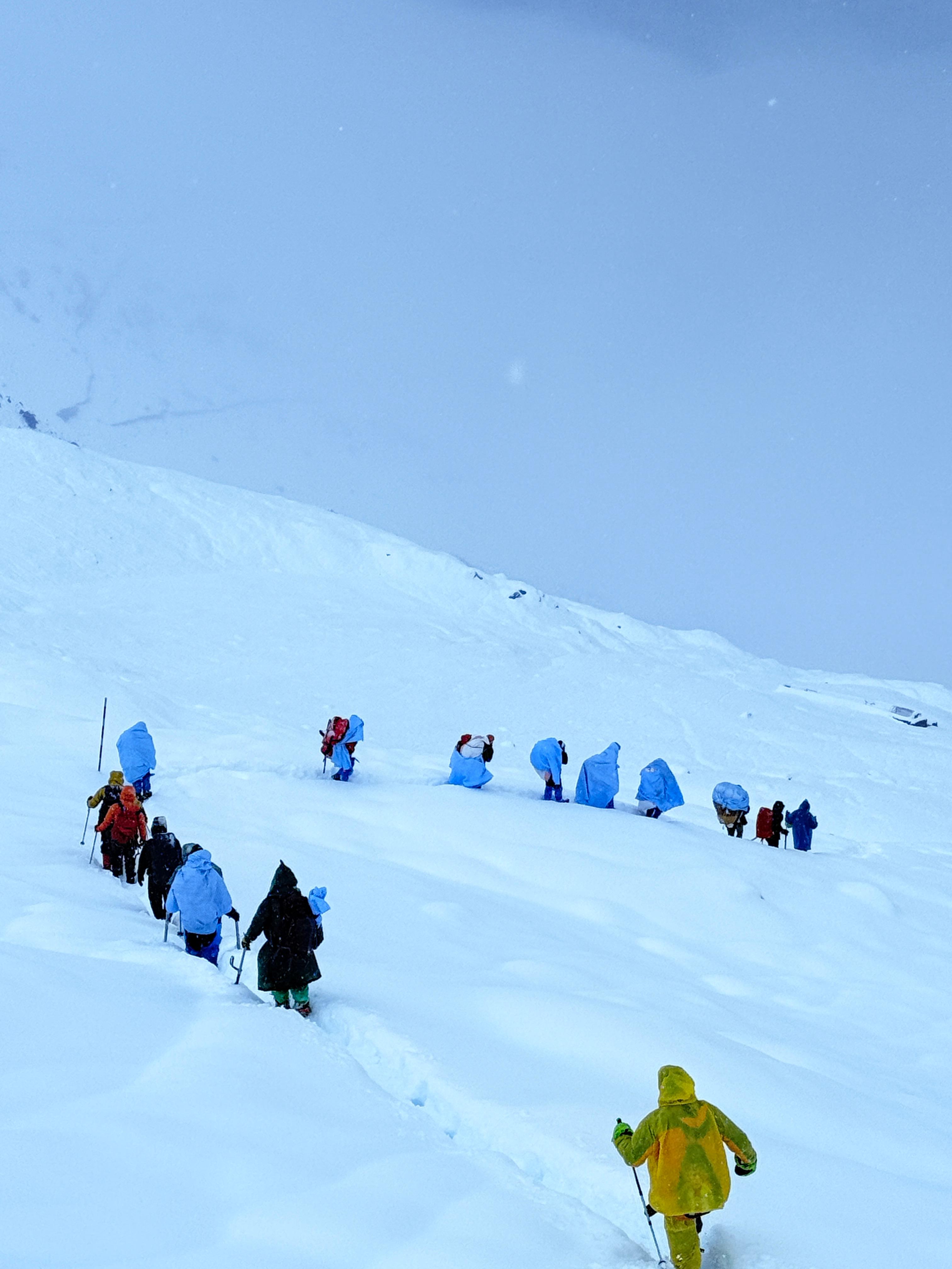 To lighten their load, the Nepali support staff left behind non-essential items such as kitchenware and tables. They crossed Dhampus Pass (5,200m) to meet rescuers.
